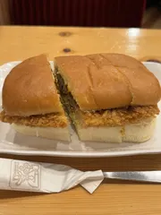 快晴だけど風も強い火曜日。今日のラッキーメニューは…カツカリーパンです❤️✨。ガッツリメニューなので飲み物はアイスミルクコーヒーたっぷりサイズ甘み抜きとお冷やです❣️到着と共に辺りがカリーのスパイシーな香りに包まれます☺️✨。ふかふかカツパンにサクサクのカツ、キャベツには辛旨カリーソースがしっかり染