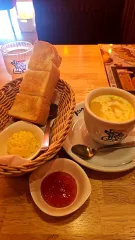 ひといき 遅めの朝ごはん。前回モーニングでジャムを頼んだら、塗られてきてしまったので、今度は別添えでと忘れずに注文できた✨