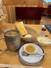 バター艶々モーニング😋 おはようございます。今日もブランチ利用のモーニング😋トーストBモーニングにヨーグルト、もったいないバナナジャムを追加です🌟すっかりバナナジャムが私のモーニングに仲間入り😁🎶笑 何も言わなくても、スープ熱め・トーストよく焼きバター多めってキッチンに伝えてくださる店長さん☺️ありがとうございま