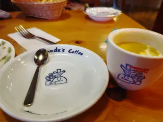 コーンスープのソーサのコメダおじさんが左。ここの店舗は、月1か月2で利用しますが今まで気づきませんでした。