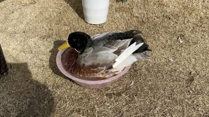 そこは水飲み場なのよ〜スッポリはまってます😂雪が降っても霰が降っても水浴びしたり、元気いっぱいです☺️