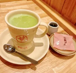 おかげ庵のあたたかい本わらび餅ドリンクは、わらび餅が柔らかくてとっても美味しいです✨もっち〜り甘くて幸せ〜🥰