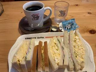 雪❄が降る前にモーニング 今日は雪❄予報が出ていますので足元気をつけて歩いて下さいね😊いつもの2番モーニングとコールスローとミニサラダを食べました。無性にホットドックを食べたくなりパンが柔らかいから食べてしまいます。その後は…お持ち帰りでチーズカリートーストとエビカツサンドをテイクアウトしました。家でお昼ご飯に食べる予定です