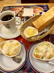 初めまして!おはようございます! 今朝頼んだのと似ていたのでコメント立ち寄らせてもらいました! コーンスープ、甘みなしのアイスミルクコーヒー、2つとも娘にあげず、1人でたいらげました☆ たまごペーストも美味しそうです!