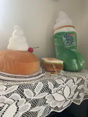 ピアノの上でずっと一人ぼっちで飾られていたシロノワールに、メロンクリームソーダとカツパンが仲間入り✨ 大きすぎて、クリームソーダの部屋の中でのアピールが強い😂でも可愛すぎる! 大切にする☺️