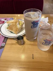 ランチへ モーニングには間に合わず。ランチに。🚙と自分の体のメンテナンスにきながら、時々来るコメダ珈琲店へ。いつものアイスオーレと初めてミニサンドのトーストを注文してみました。