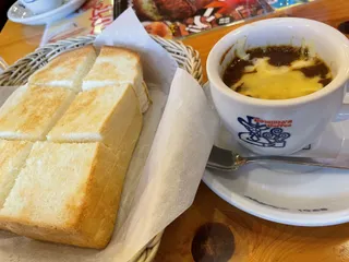 くつろぎタイム延長 既に3時間経過モーニングからのランチタイム突入チーズカリートースト🍞モバイルオーダーで厚切り欄があったのでチェック✅入れてみましたあ、厚すぎる😳普通はこれの半分くらいだと店員さんに教えてもらいました。チーズカリーはちょっとだけ形状の違うコーヒーカップにIN斬新だわ😂チーズとろ〜り美味いに決まってます