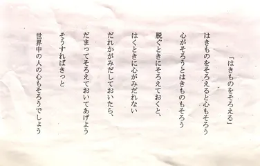 これは先日の夜に通りすがりに偶然見つけたのですが・・・ 長野県にある お寺の住職が読んだ "詩" です 何を訴えようとしたかを考えて見ました 自分の靴をそろえずに脱ぎっぱなしにするという行動は後から来る人のことを考えていない訳で 反対に自分の靴をそろえることができる人って言うのは 自分の