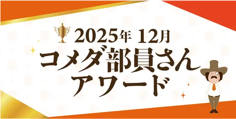 2025年12月コメダ部員さんアワード いつもさんかく屋根の下を楽しんでいただきありがとうございます。さんかく屋根の下では、普段コミュニティをお使いいただいているコメダ部員さんに感謝の気持ちを込めて、月ごとに表彰させていただく『コメダ部員さんアワード』を紹介していきます。受賞者バッジはマイページで見れるので、ぜひコレクションしてくださいね