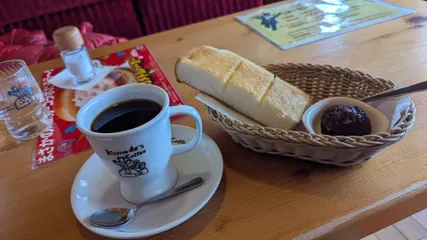 福袋についてたチケットを使ってオーダーしました。前から気になっていた小倉トーストです。布団から出られずモーニングに間に合わなかったのでちょうどいいやと思ってたところです。厚切りのよく焼きでオーダーしましたが、大きい!これでもかと多い小倉あんと、バターが塗り放題は嬉しいですね!パン二枚に塗っても大分余