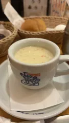 昨日の初!クラムチャウダー 昨日はコメダのスープ飲んだことないなぁと思い、クラムチャウダー頂きました!あんなに具たくさんのクラムチャウダーはじめて!リピします👍 スープもモーニングつくんですね!遠慮せず頂きました✨️ 暖かくなったのでクリームソーダロンT着たよ〜って投稿したんですけど、ロンT1枚?!ってびっ