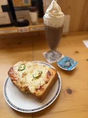 明日から春休みなのでご褒美ということでコメダに来ました。久しぶりのピザトースト、マジで美味しい。チーズ、卵、トマトソース、野菜のバランスが完璧。からしマヨネーズのアクセントもいい。コメダの卵ペーストって美味しいですよね。何気にアイスココア初めて頼みました。まろやかなソフトクリームと甘さ抜群のココアは