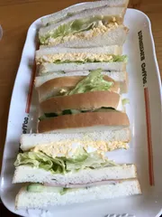 今日は雲のち雨☔️桜もだいぶ🌸咲いて春⁉️ですね〜久しぶりの今日明日連休😅今日も〜 🥪 🥪 🥪 🥪 🥪レギュラーメニューを休日の癒し時に制覇を目指して❗❗ 🍴御食事編(スナック)😋(飲み物&モーニング&限定&デザートメニューを除く)(3)ミックスサンド🥪☆オプション☆からしマヨネーズ・マヨネー