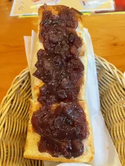 モーニングギリギリ2回目女登場です😅 ずうずうしくもモーニング2回目注文させてもらいました 1回目はたまごペーストとコメダブレンド 2回目はおぐらあんとレモンティー どちらも最初に全部塗り塗り パンが半分になった時点でおぐらあんに塩🧂ふりかけてみました しょっぱさが合う! 塩あすぎ大福が存在するんだ