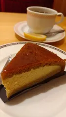 NEW ごちそうカスタード 待ってました🙌新作ケーキ🍰 今回一番に食べようと思ってたのが、ごちそうカスタード🥰 カスタードクリームがたっぷり✨ でも上がカラメルのかかったスポンジで、香ばしさとほろ苦さもあってカスタードに合う〜🥹 そしてドリンクはブラックにすれば良かったとちょっと後悔🤣ミ