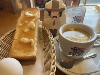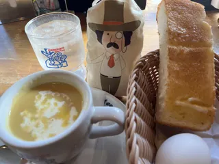 今日もモーニングできたけど・・・💦 皆さん♪こんにちは😃 今日もコーンスープ🌽①モーニングできました〜💓今日はバターもやや多め🧈。 モバイルオーダーになってから、①と④のゆで卵には豆皿が付かなくなったので、バター多めの時はカゴと紙ナプキンにバターがべったり染み込んで、紙ナプキンにバターを食べられたみたいになることが