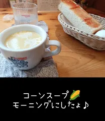 NEW コーンスープが沁みる……(*´ェ`*) 少し風邪ぎみで、コーンスープ🌽が沁みるモーニング。 鼻が詰まっていて、スープの香りがぼやけています…(*´ェ`*)ぐすん