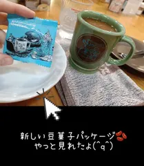 モーニングセットが多いので、飲み物を頼んでも豆菓子を見る機会が少なく……(._.) やっと新しい豆菓子パッケージを見ることができました(^q^) 水色で芸術的なデッサンタッチで素敵です♪