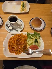 ナポリタン初体験! 初めて投稿します。ポケモン好きの子どものご要望により、本日はコメダディナーです。初ディナータイム、初ナポリタンそして初ホットミルクです。