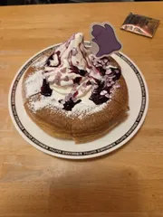圧巻! メタモンのやつ!隣の席の小学生がガン見😄2切れもらいましたが、ブルーベリーソースとアイスクリームが溶け合ってヨーグルトソースの味わい☺️至福のひととき。