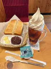今日コメ☆ 今日はなんだか... よく焼き厚切りに変えてもらった小倉トーストにいたしました🍞クリームコーヒーは残念!特盛ソフトではなかったです🤭