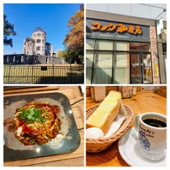 広島の旅🚝 以前、空港で一緒だった友人に会いに広島へ来ました🚝 市内を案内してもらい、爆心地、原爆ドームや広島城へ🏯 リクエストしていたお好み焼も😋府中焼きって言って、生地に乗せるお肉が薄切りではなく、味つけミンチなんです🥓 行列が出来る人気店で、甘辛くて美味しかったです😋 勿論、