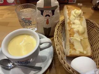 15分前に姫路駅近くの店舗に入るも案内待ち...1名様優先案内発動で終了5分前にモーニング注文出来ましたコメダブレンドは無料ドリンク券を行使して実質🍮代のみありがたい無料ドリンク券😙🎫またお願いします🙇 厚切り山食パン断面🍞🥚 ショコラノワールは売り切れ ならばこれ安定