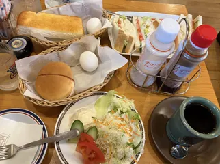 雨の日曜日☔️ 結構な雨降りの日曜日☔気分転換に近くのマイコメさんへ🚗💦💦満席でベンチで順番待ち〜〜👩🏻🦰👨案内された席は2人席だったので、テーブルに載りきれなくて…ギュギュッと寄せて撮影📸 選べるモーニング🍞🥚☕️のセットにミニサラダ🥗❗️私の定番✨山食パン➕🍓ジャム→ローブバンに変更❗️今日のミニサ